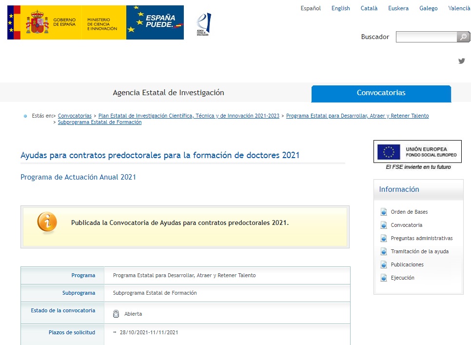 En el BOE del 17 de octubre, la Presidencia de la Agencia Estatal de Investigación ha publicado el anuncio de la convocatoria de 2021 de ayudas para contratos predoctorales para la formación de doctores asociadas a proyectos de investigación. Los proyectos de la Universitat Politècnica de València susceptibles de asignación de ayuda están disponibles en la web del Ministerio de Ciencia, Innovación y Universidades, en el siguiente enlace: proyectos.