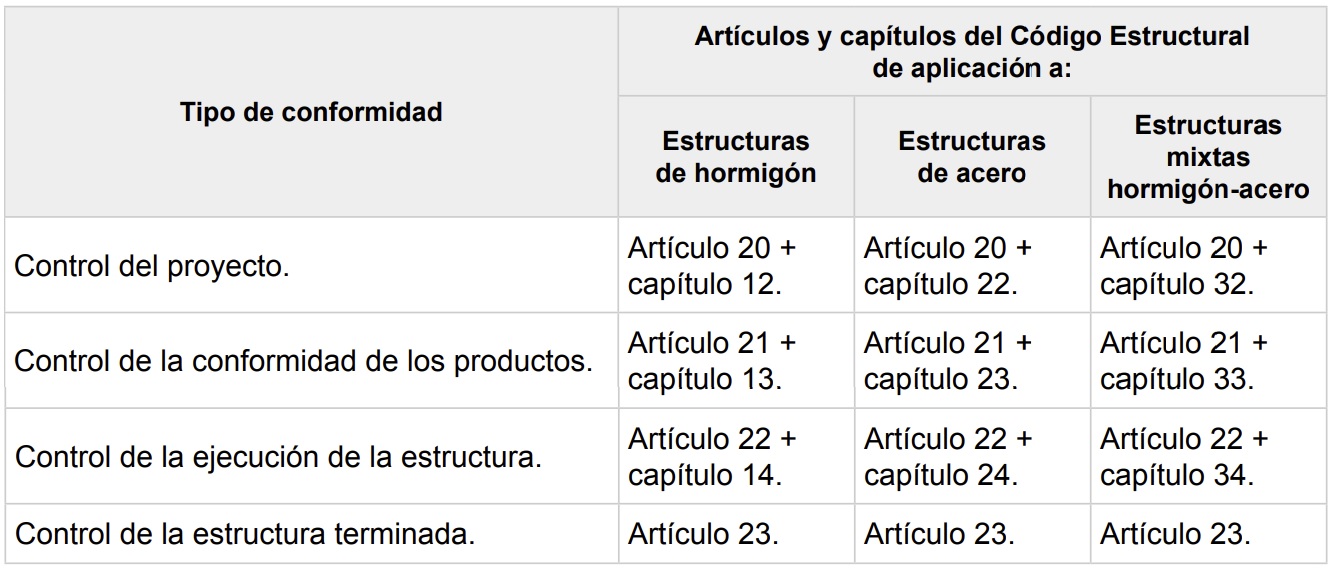 La conformidad de la estructura precisará también de la realización de los controles efectuados durante su ejecución que se señalan en la tabla 17.1.
