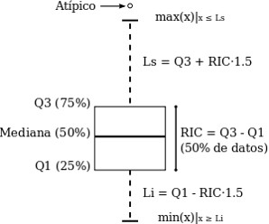 El método más habitual por su sencillez y resultados es el test de Tukey, que toma como referencia la diferencia entre el primer cuartil (Q1) y el tercer cuartil (Q3), o rango intercuartílico. En un diagrama de caja se considera un valor atípico el que se encuentra 1,5 veces esa distancia de uno de esos cuartiles (atípico leve) o a 3 veces esa distancia (atípico extremo). Se trata de un método paramétrico que supone que la población es normal (Figura 2). No obstante, también existen métodos no paramétricos cuando la muestra no supere la prueba de normalidad correspondiente.