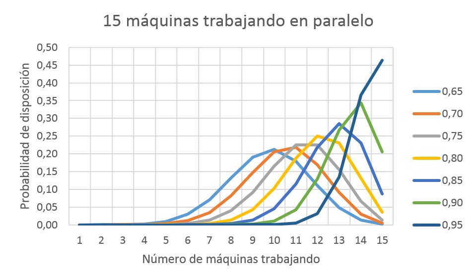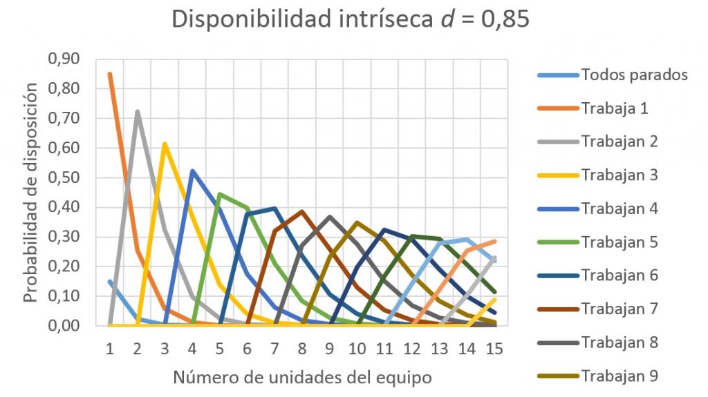En la Figura 3 se muestra la probabilidad de disposición de un conjunto de máquinas trabajando en paralelo en función del número de unidades del equipo y la cantidad de ellas que se encuentran trabajando, para una disponibilidad intrínseca d = 0,85. Por ejemplo, para un conjunto de 10 unidades, la probabilidad de que se encuentren trabajando 9 de ellas, es del 34,7%. Como resulta evidente, si hay solo un equipo, la probabilidad de que trabaje es del 85%, que coincide con su disponibilidad intrínseca. Se observa que las probabilidades máximas de disposición disminuyen conforme aumenta el número de unidades del equipo y la exigencia de que esté un número mayor de ellas trabajando.