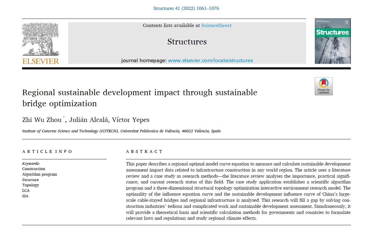 Acaban de publicarnos un artículo en Structures, revista indexada en el JCR. Se trata de establecer un modelo para evaluar el impacto del desarrollo sostenible regional a través de la optimización de puentes. El trabajo se enmarca dentro del proyecto de investigación HYDELIFE que dirijo como investigador principal en la Universitat Politècnica de València y de la dirección de la tesis doctoral de Zhi Wu Zhou.