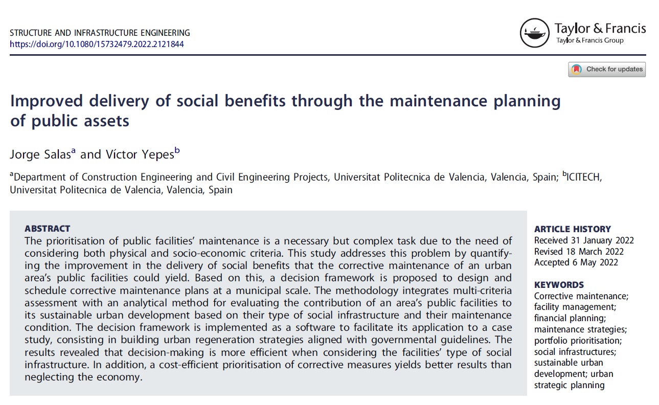 SALAS, J.; YEPES, V. (2024). Improved delivery of social benefits through the maintenance planning of public assets. Structure and Infrastructure Engineering, 20(5):699-714. DOI:10.1080/15732479.2022.2121844
