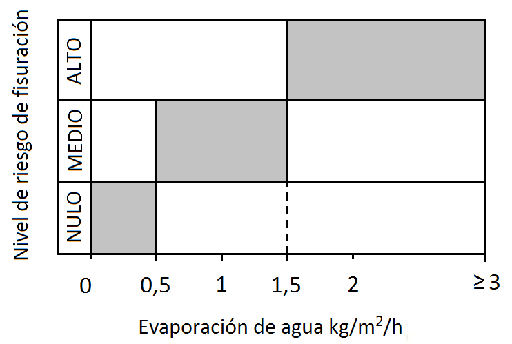 Para evitar que se formen fisuras por agrietamiento plástico, se evalúa la pérdida de humedad superficial. Si la tasa de evaporación se acerca a 1 kg/m2/h, es necesario tomar precauciones contra el agrietamiento por contracción plástica. El nivel crítico por debajo del cual no se producen grietas es de 0,5 kg/m2/h. A partir de 1,5 kg/m2/h, aparecen las fisuras con toda probabilidad. La velocidad del aire o del viento horizontal debe medirse a 0,5 m por encima de la superficie de evaporación. La temperatura del aire y la humedad relativa se deberían medir entre 1,2 y 1,8 m por encima de la superficie de evaporación en la zona protegida del viento y de los rayos del sol (Lerch, 1957). En la Figura 2 se muestra en una tabla el riesgo de fisuración en función de la evaporación del agua.