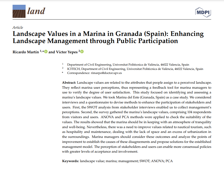 Acaban de publicarnos un artículo en la revista Land, revista indexada en el JCR. En este caso se ha analizado la mejora de la gestión del paisaje en un puerto deportivo de Granada a través de la participación pública en la identificación y evaluación de valores paisajísticos. El trabajo se enmarca dentro del proyecto de investigación HYDELIFE que dirijo como investigador principal en la Universitat Politècnica de València.