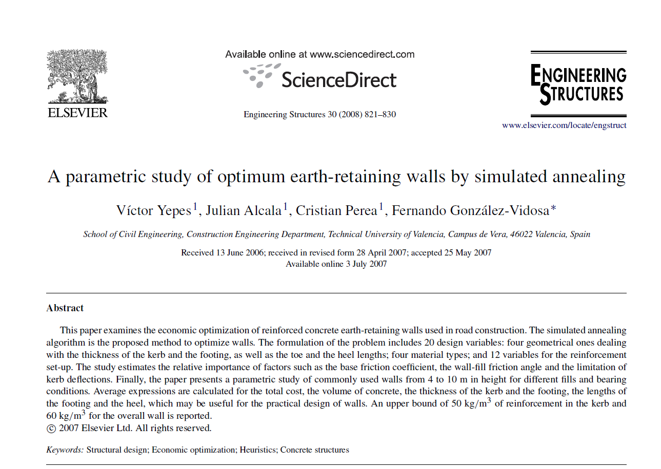 YEPES, V.; ALCALÁ, J.; PEREA, C.; GONZÁLEZ-VIDOSA, F. (2008). A Parametric Study of Optimum Earth Retaining Walls by Simulated Annealing. Engineering Structures, 30(3): 821-830. DOI:10.1016/j.engstruct.2007.05.023