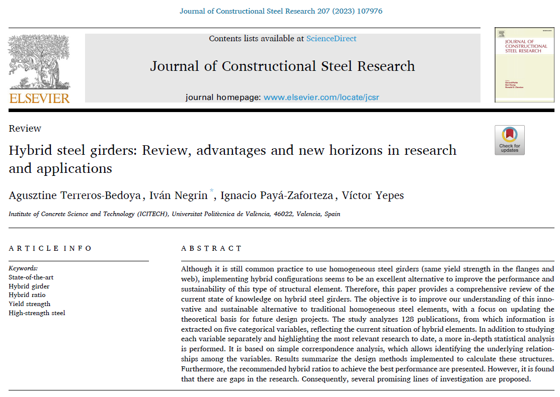 TERREROS-BEDOYA, A.; NEGRÍN, I.; PAYÁ-ZAFORTEZA, I.; YEPES, V. (2023). Hybrid steel girders: review, advantages and new horizons in research and applications. Journal of Constructional Steel Research, 207:107976. DOI:10.1016/j.jcsr.2023.107976.