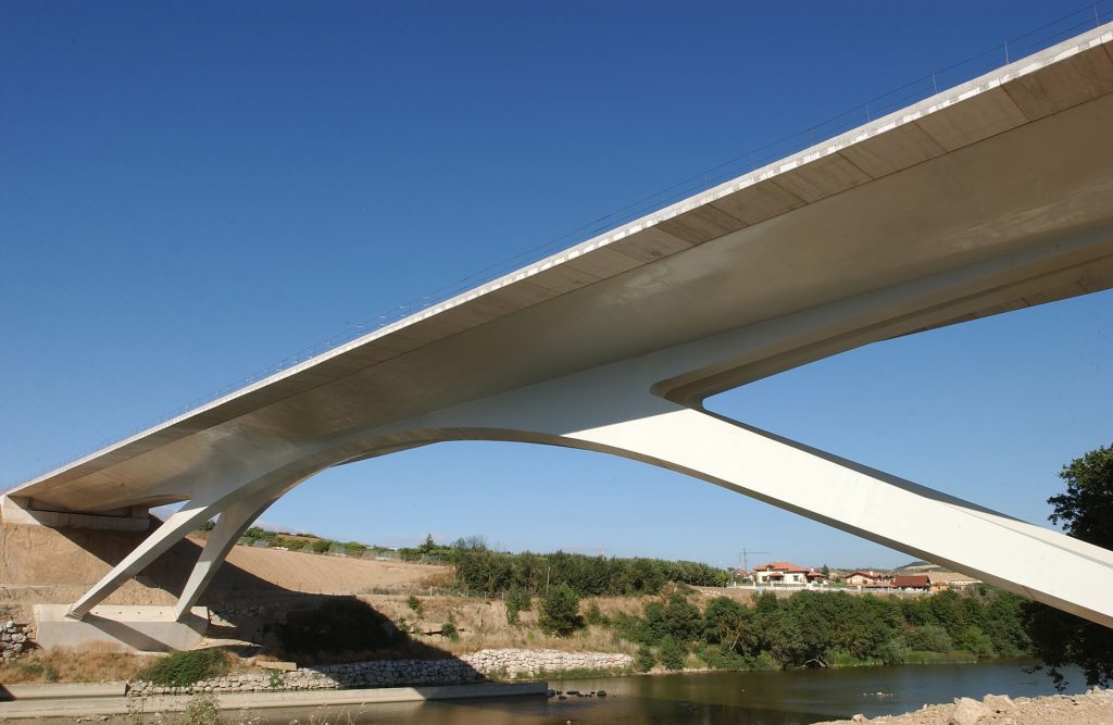 Figura 1. El puente sobre el río Arga de la A-12, en Puente la Reina (Navarra), de Javier Manterola, de 120 m de luz. https://www.hortacoslada.com/es/proyectos/puente-rio-arga/