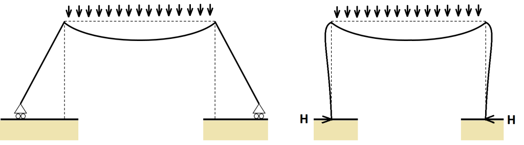 Si la unión entre las pilas y el dintel es de articulación simple, la deformación del tablero bajo cargas verticales será similar a la de una viga simplemente apoyada. Si la unión es empotrada, la deformación seguirá el patrón indicado en la Figura 4, lo que dependerá de si el terreno ejerce empujes horizontales.