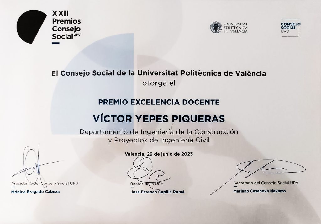 Ayer jueves 29 de junio de 2023 recibí el Premio Excelencia Docente del Consejo Social de la Universidad Politécnica de Valencia, en su XXII edición. Es un premio muy especial, pues se concede a nivel personal y es un reconocimiento valorado por aquellos que nos dedicamos a la docencia. Además, solo se concede una vez, siendo un premio al que no debes presentar ninguna candidatura, por lo que fue una auténtica sorpresa. Muy agradecido por ello.