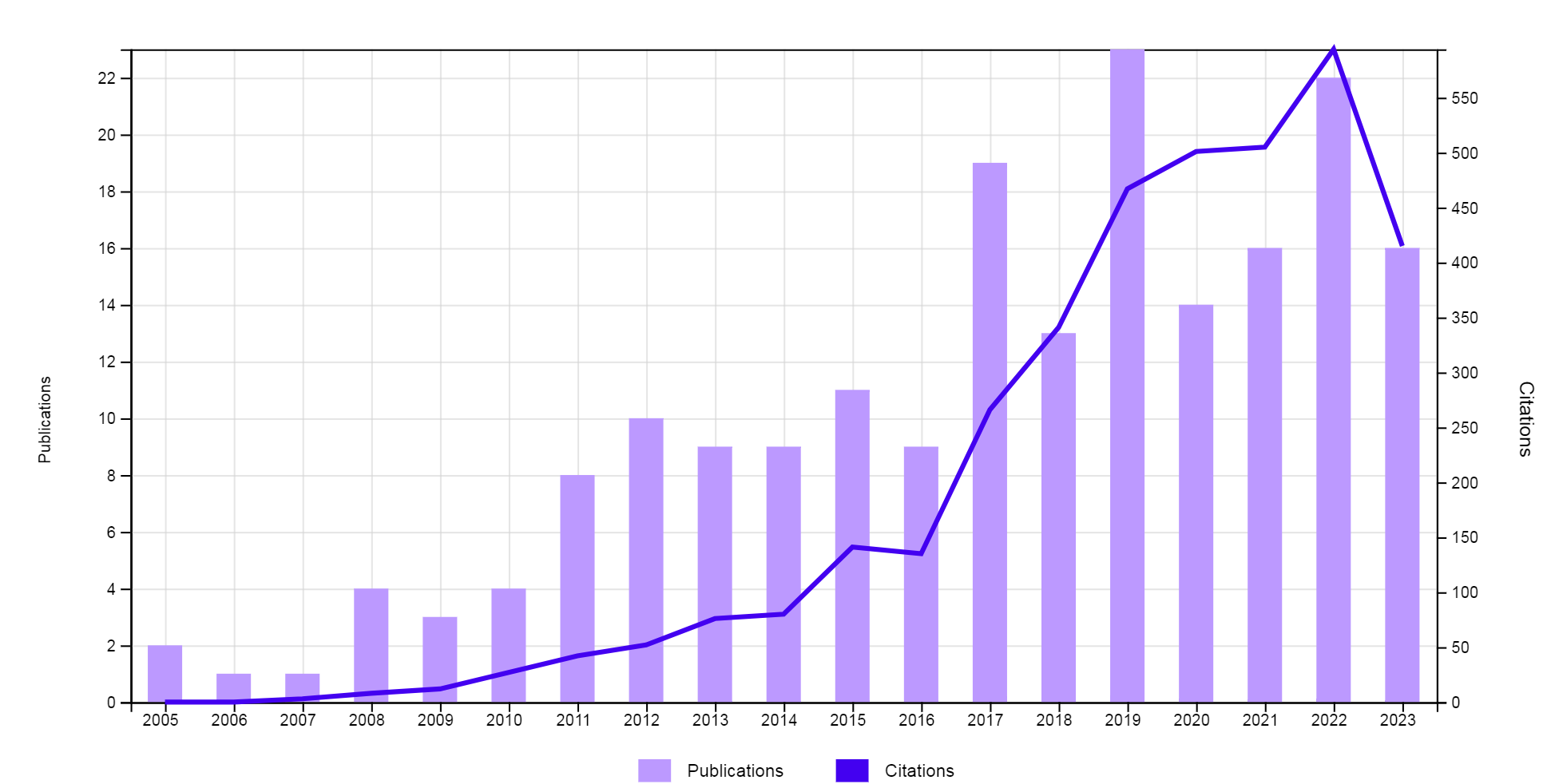 En la figura que sigue se puede ver la trayectoria tanto de artículos publicados como de citas. No obstante, faltan contabilizar 5 artículos en el 2023. Además, siete de estos artículos tienen más de 100 citas.