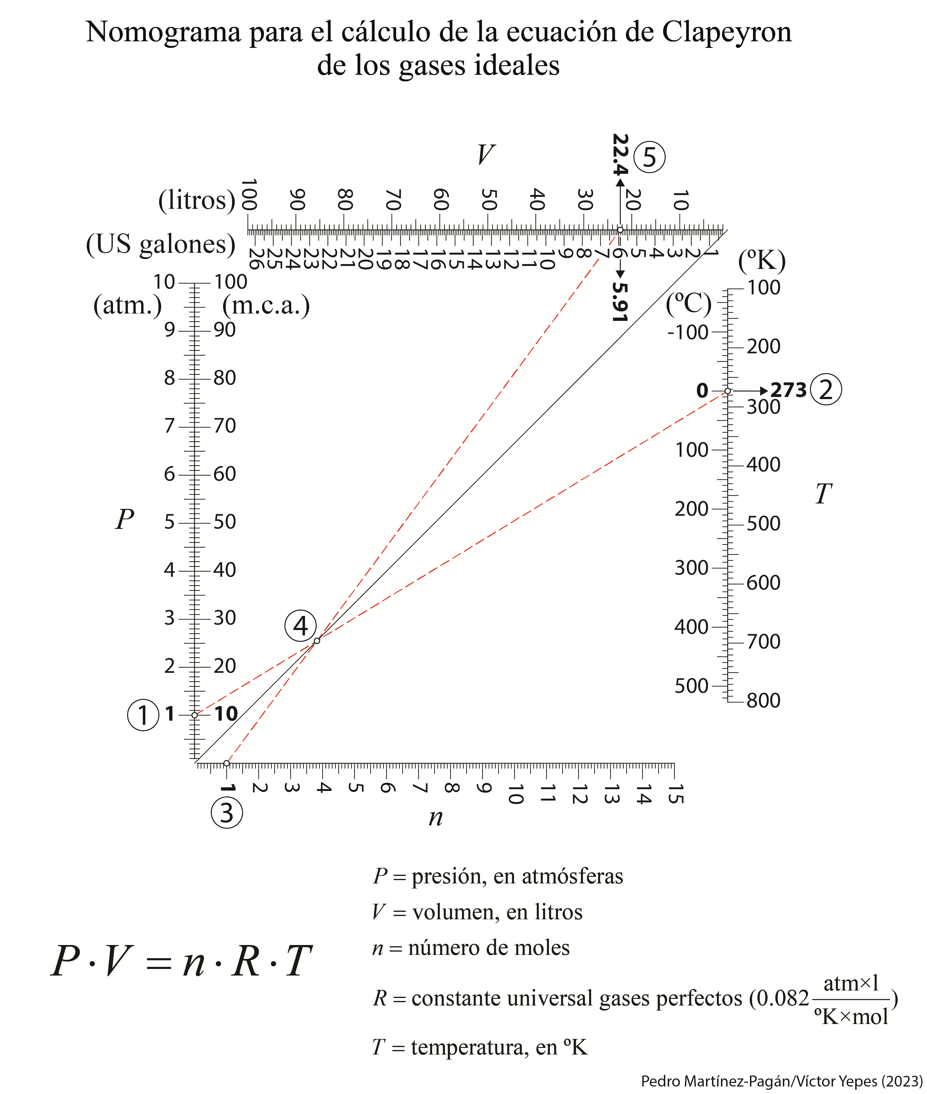 A continuación os dejo un nomograma elaborado en colaboración con el profesor Pedro Martínez Pagán, de la Universidad Politécnica de Cartagena, donde se puede calcular gráficamente la ecuación de estado para un gas ideal. En este caso, se ha calculado el volumen de un mol de un gas ideal a 1 atmósfera y 0 °C, que es de 22,4 litros. Espero que os sea de interés.