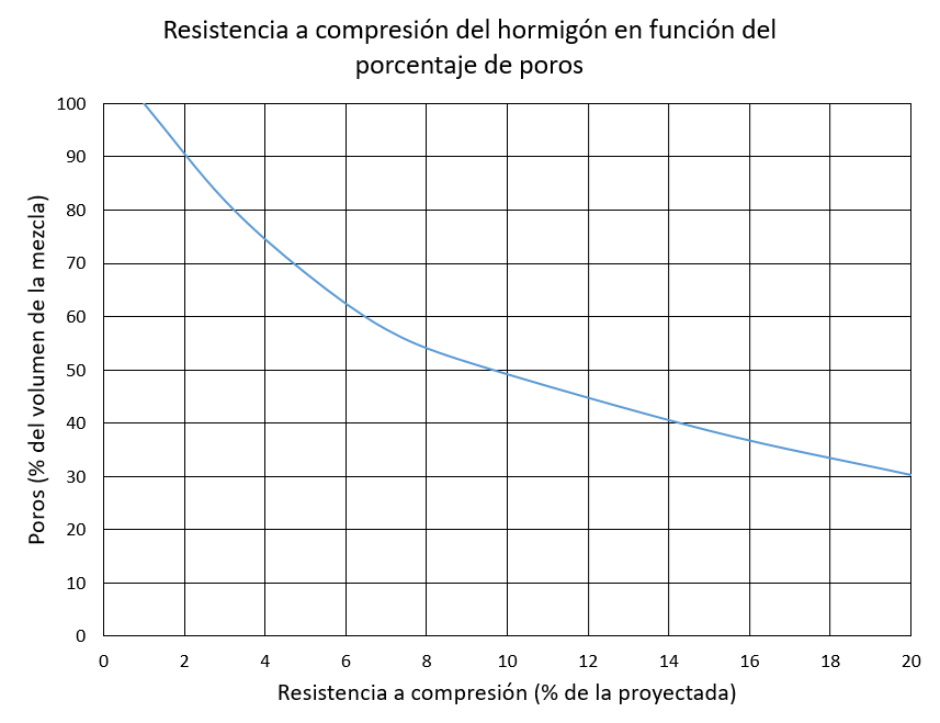 - El aire ocluido reduce la resistencia del hormigón (Figura 2). Por cada 1% de aire retenido, la resistencia disminuye entre 4% y 7%. Como resultado, un hormigón con, por ejemplo, un 3% de vacíos será entre un 15% y un 20% menos resistente de lo esperado.