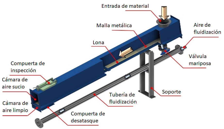 También se le conoce como transportador activado por aire o transportador neumático por gravedad. Este sistema consta de un conducto rectangular dividido en dos secciones: una superior, denominada «cámara sucia», y una inferior, llamada «cámara limpia». El material se introduce por la parte superior del conducto a través de un medio poroso, mientras que el aire a presión se introduce por la parte inferior, en la cámara limpia. El aire atraviesa el medio poroso y fluidifica el material, lo que permite que este se deslice de manera continua desde la entrada hasta la salida. Su uso para el transporte del cemento está bastante limitado.