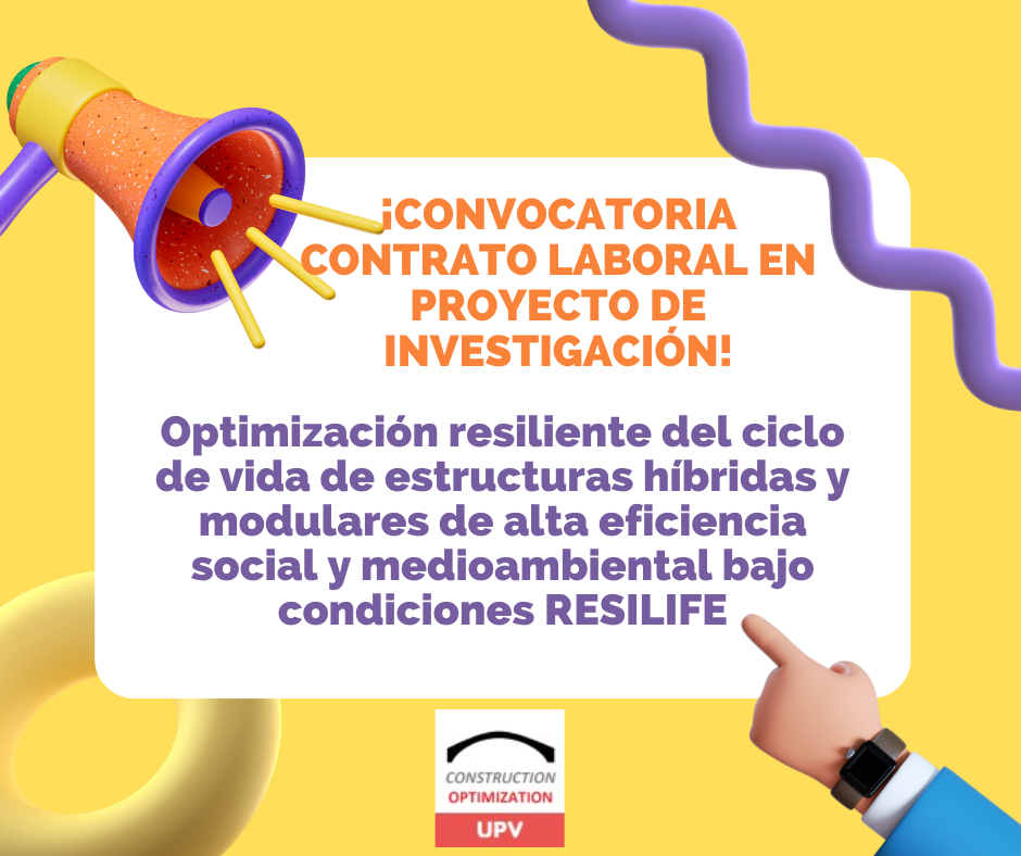 Se ha publicado en la web de Vicegerencia de Recursos Humanos de la Universitat Politècnica de Valencia la convocatoria para la contratación laboral de un técnico medio que desarrollará sus funciones en el proyecto “Optimización resiliente del ciclo de vida de estructuras híbridas y modulares de alta eficiencia social y medioambiental bajo condiciones RESILIFE”, financiado por la Agencia Estatal de Investigación.