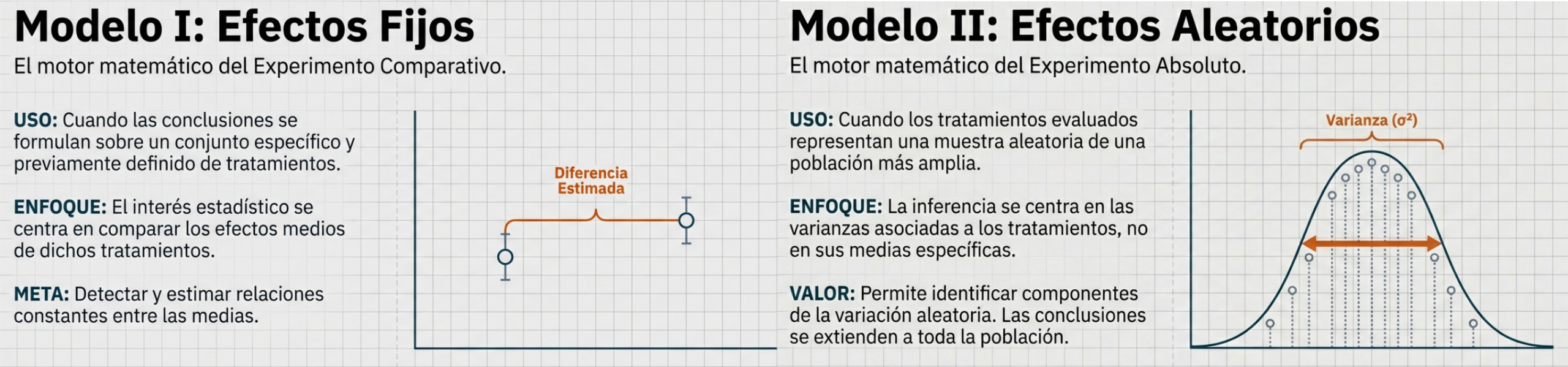Modelo de efectos fijos: se utiliza cuando las conclusiones se formulan sobre un conjunto específico y previamente definido de tratamientos. En este caso, el interés estadístico se centra en comparar los efectos medios de dichos tratamientos.