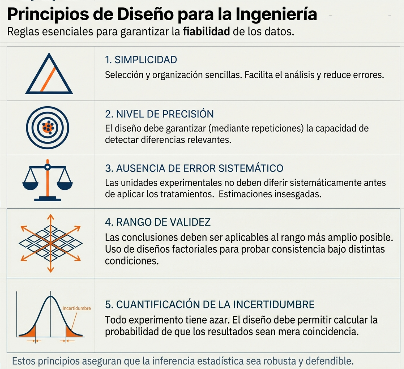 Dado que las decisiones sobre las hipótesis dependen directamente de experimentos cuidadosamente planificados, es esencial que dichos ensayos cumplan con una serie de principios básicos. A continuación se resumen los más importantes, con un enfoque práctico para la ingeniería: