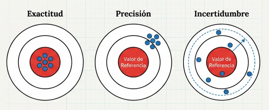 Para navegar por esta complejidad, distinguimos entre exactitud (cuán cerca está nuestra flecha del centro de la diana) y precisión (cuán cerca están las flechas entre sí, independientemente de dónde hayan caído).