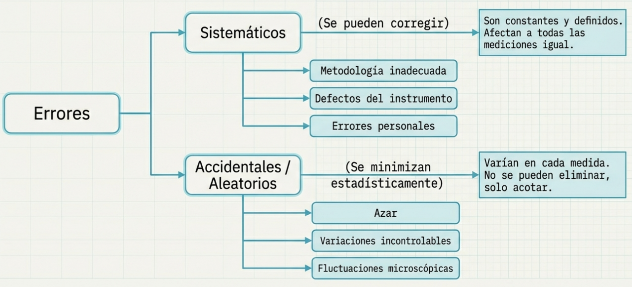 - El error accidental o aleatorio es el «ruido» del universo. Se debe al azar, a variaciones microscópicas y a factores incontrolables. Se manifiestan como pequeñas fluctuaciones al repetir una medición y, aunque no pueden eliminarse, la estadística es nuestra herramienta para controlarlas.