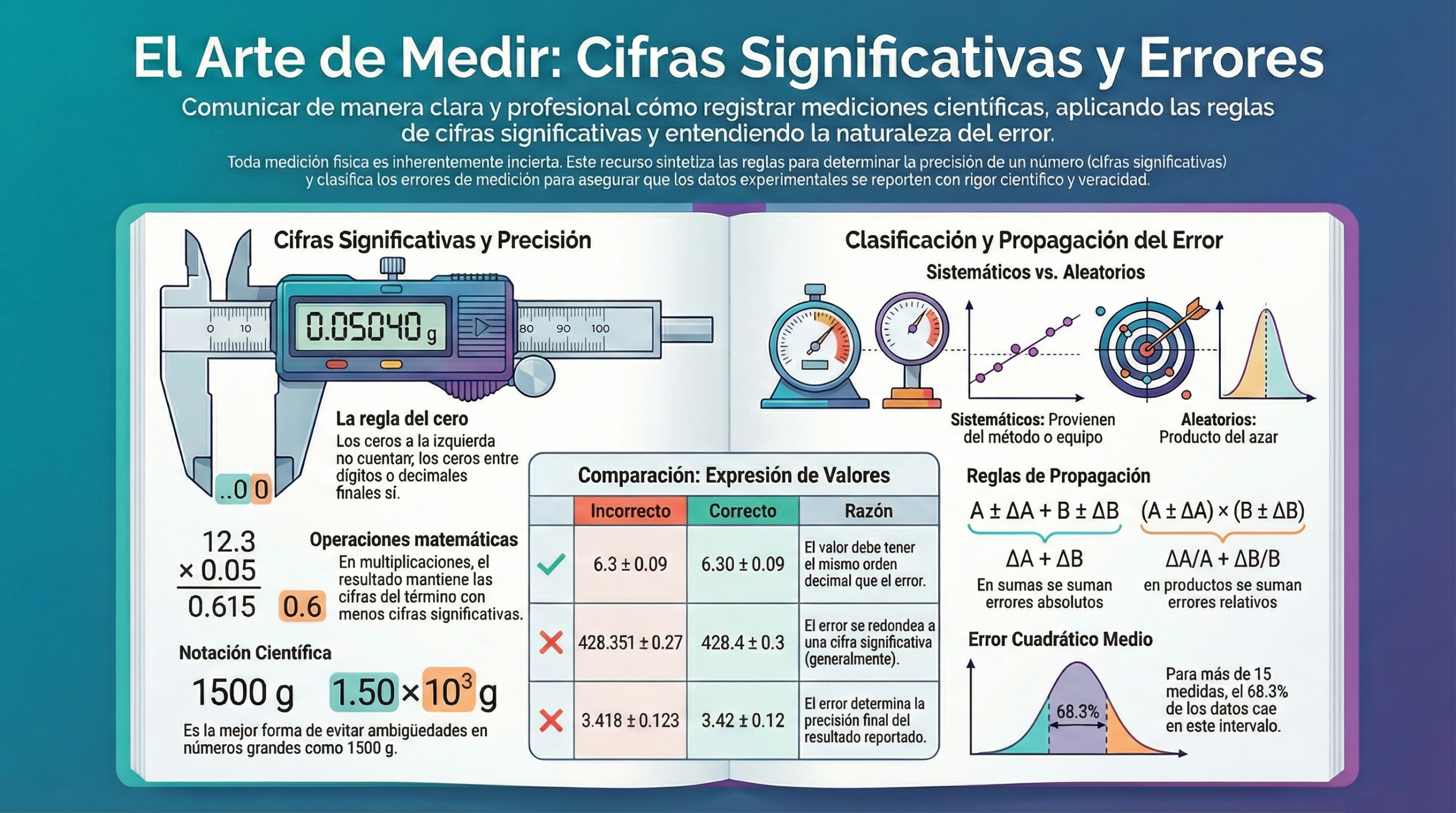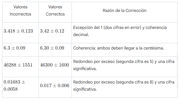La regla del redondeo es estricta: se redondea por exceso en una unidad si la segunda cifra es 5 o superior. Finalmente, el valor y su error deben tener el mismo número de decimales.