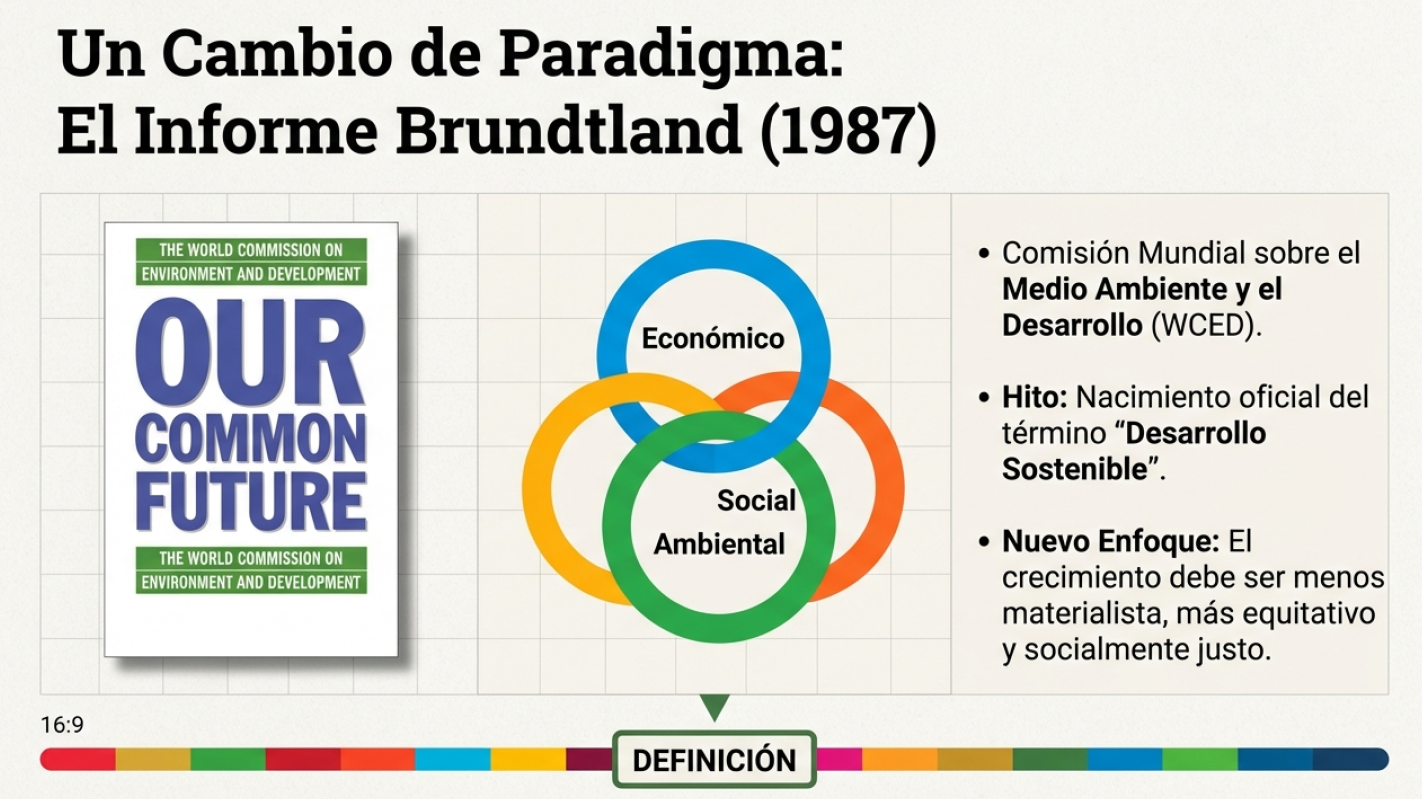 En 1983, la Comisión Brundtland recibió el encargo de replantear un modelo de desarrollo global que estaba devorando su propio entorno. El informe final de 1987, Nuestro futuro común, no proponía dejar de crecer, sino transformar radicalmente la «calidad del crecimiento» para hacerlo menos materialista y menos intensivo en energía.