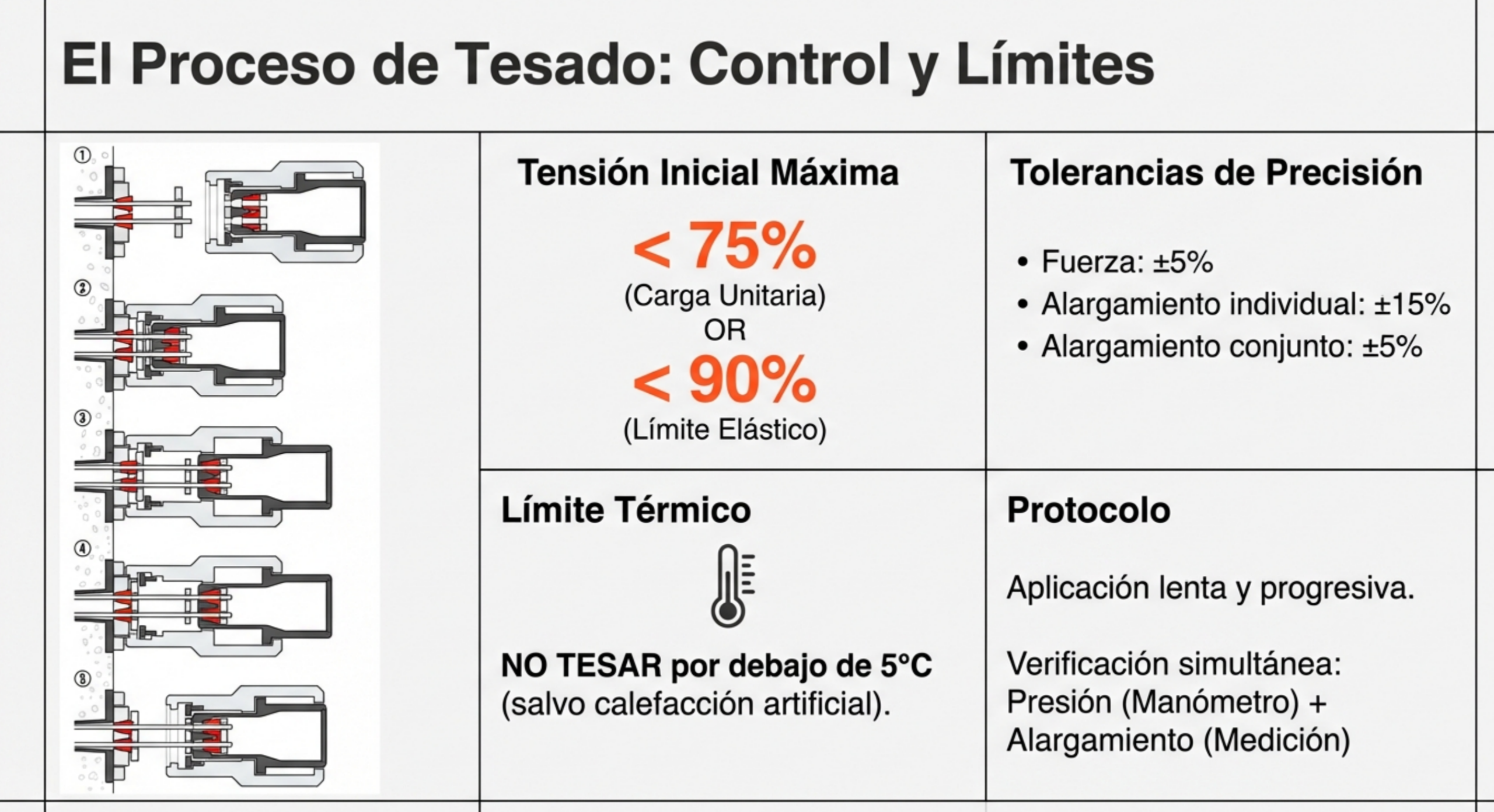 En obra, la precisión no es negociable. La fuerza aplicada debe mantenerse dentro de un margen de ±5 % respecto al valor del proyecto. Controlamos los alargamientos con tolerancias muy estrictas: un máximo de ±15 % para un tendón individual, pero solo de ±5 % para el conjunto de tendones de la misma sección. Además, como ingenieros sénior, sabemos que el termómetro manda: está prohibido iniciar el tesado por debajo de 5 °C sin medidas especiales. Es una máxima del sector que