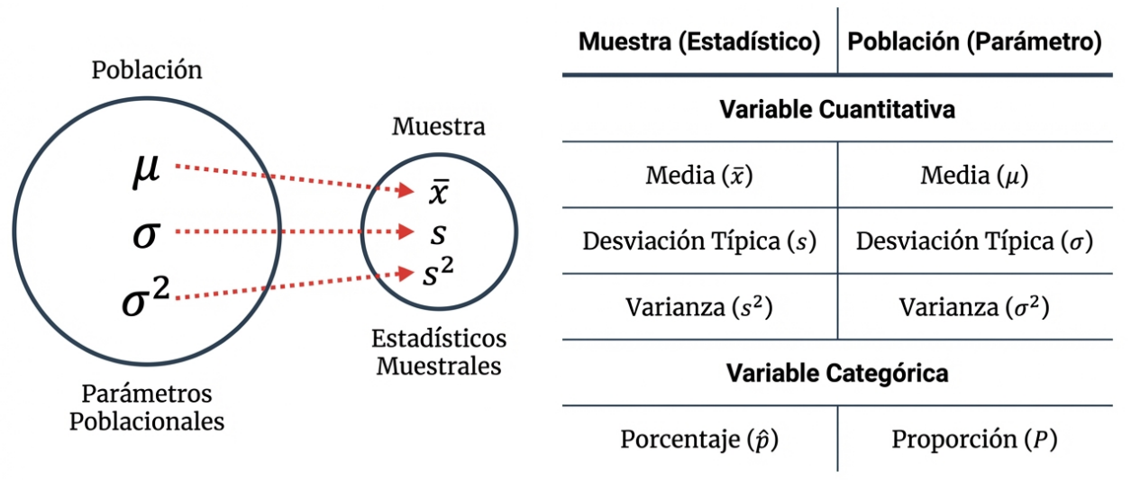 Para descifrar la realidad, primero debemos distinguir entre los dos protagonistas del análisis: la población y la muestra. La población es el conjunto total que deseamos estudiar y la muestra es un subconjunto extraído de forma aleatoria que nos sirve de ventana para observar la población.