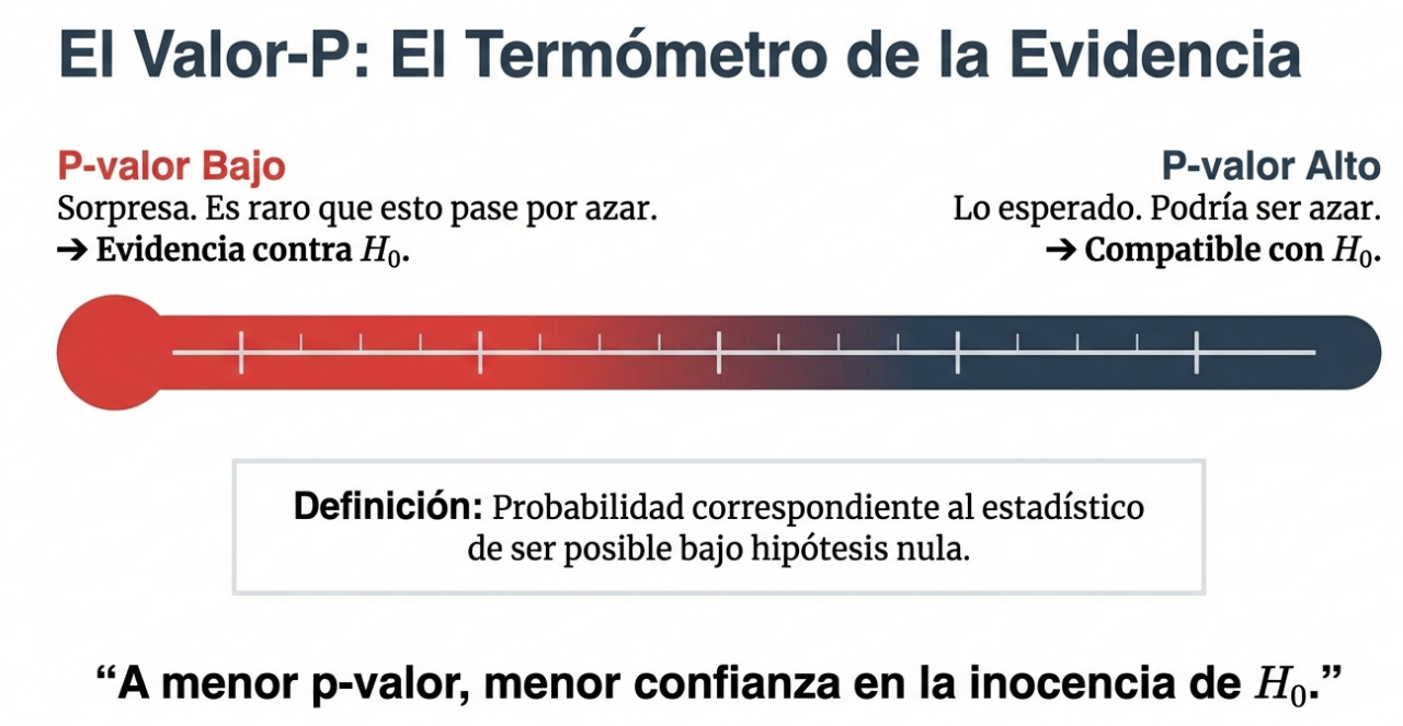 Para decidir si rechazamos la hipótesis nula, calculamos el p-valor (o significación muestral). A diferencia de lo que se cree popularmente, el p-valor no es un corte arbitrario, sino la probabilidad de obtener nuestros resultados si la hipótesis nula fuera cierta. Comparamos este p-valor con el nivel de significación (α), que es el límite preestablecido. Si p ≤ α, la evidencia es tan fuerte que rechazamos la situación «habitual» en favor de la hipótesis alternativa.