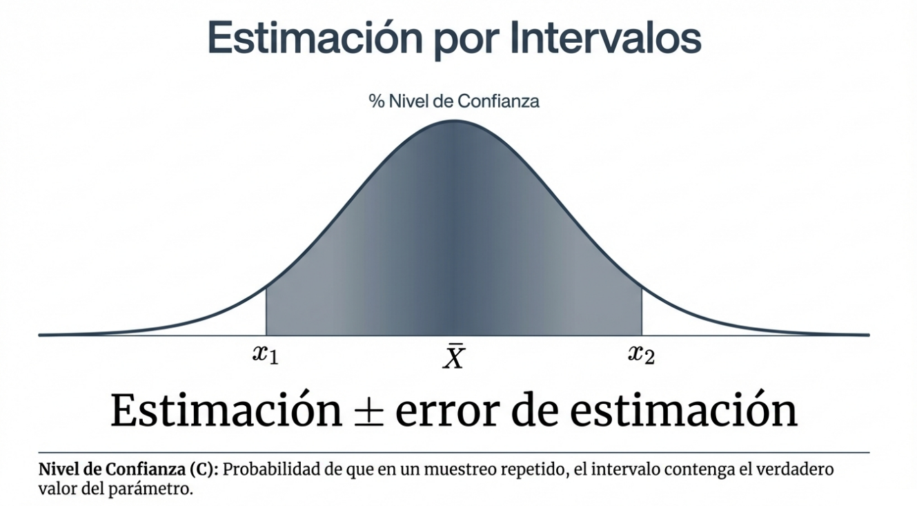 Dado que trabajar con muestras implica un error aleatorio inevitable, la estadística no ofrece un único número como verdad absoluta. En su lugar, construimos un intervalo de confianza de nivel C.