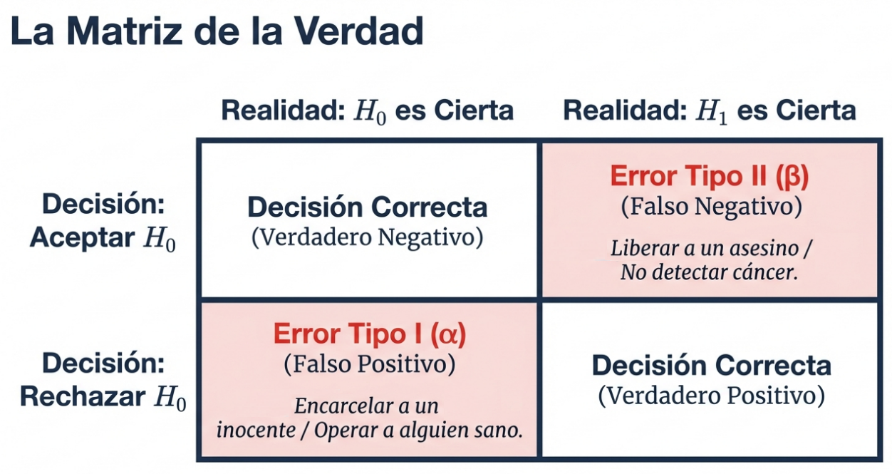 En cualquier prueba estadística, asumimos el riesgo de tomar una decisión equivocada. Estos errores se dividen en dos categorías fundamentales: