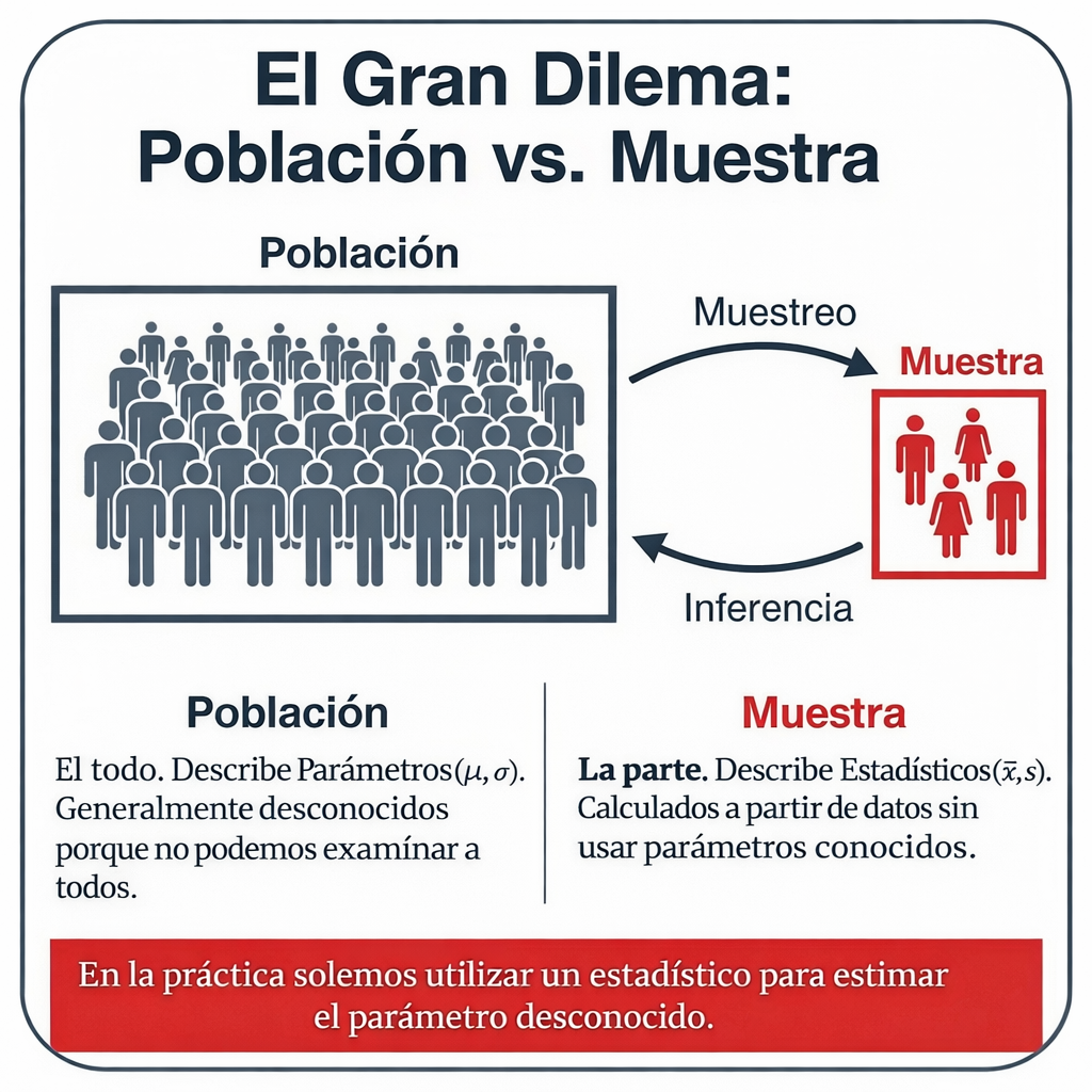 Para descifrar la realidad, primero debemos distinguir entre los dos protagonistas del análisis: la población y la muestra. La población es el conjunto total que deseamos estudiar y la muestra es un subconjunto extraído de forma aleatoria que nos sirve de ventana para observar la población.