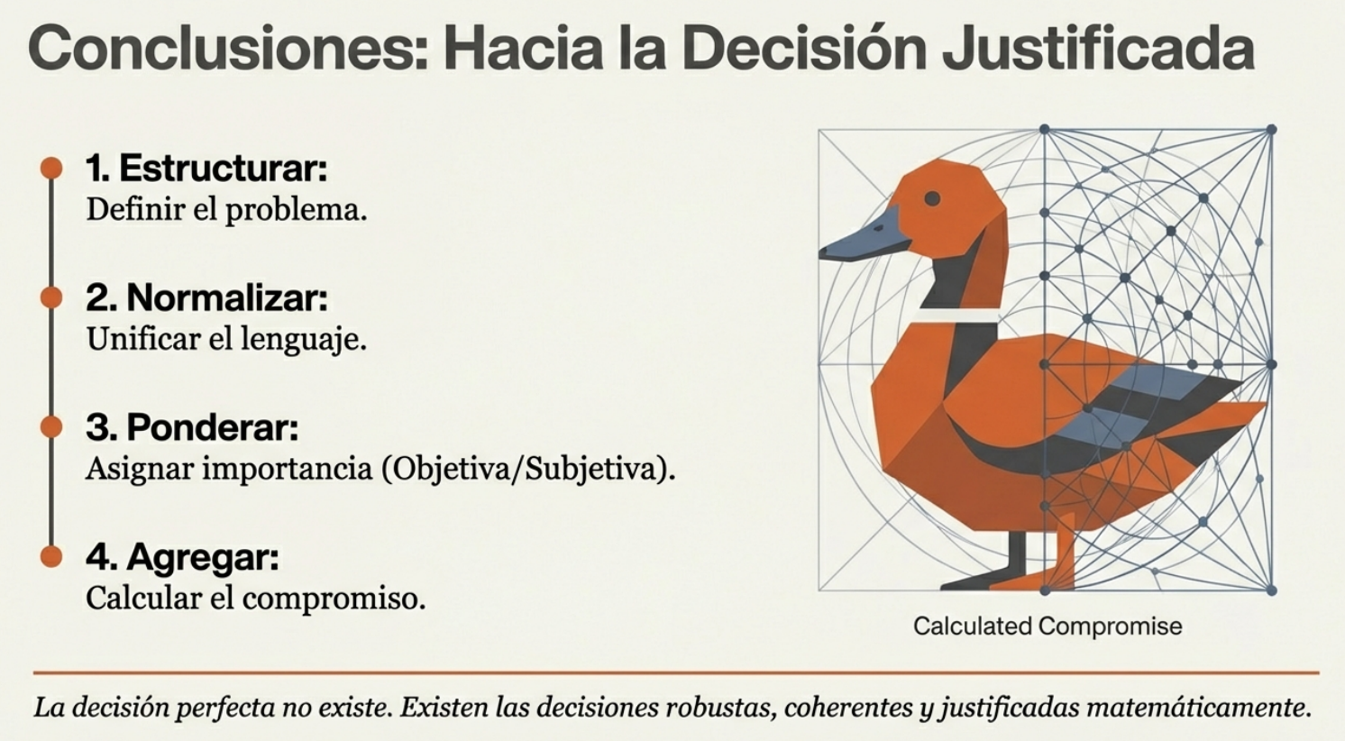 Desde la perspectiva de la ciencia de las decisiones, el pato es el ganador inesperado de esta contienda evolutiva. Aunque no corre tan rápido como un guepardo, no vuela con la potencia de un halcón ni nada con la destreza de un pez espada, el pato puede realizar las tres acciones con eficacia. En un modelo de decisión multicriterio, el pato representa una «solución de compromiso»: aquella que maximiza la utilidad global en diversos escenarios.