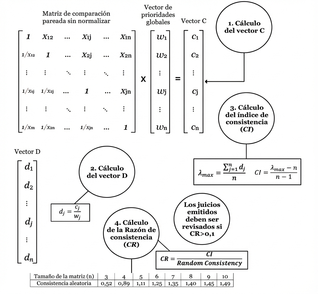 El AHP calcula una razón de consistencia (CR). Si este ratio es elevado, el «autovector» (o vector de prioridades) de la decisión se distorsiona y el juicio pierde validez.
