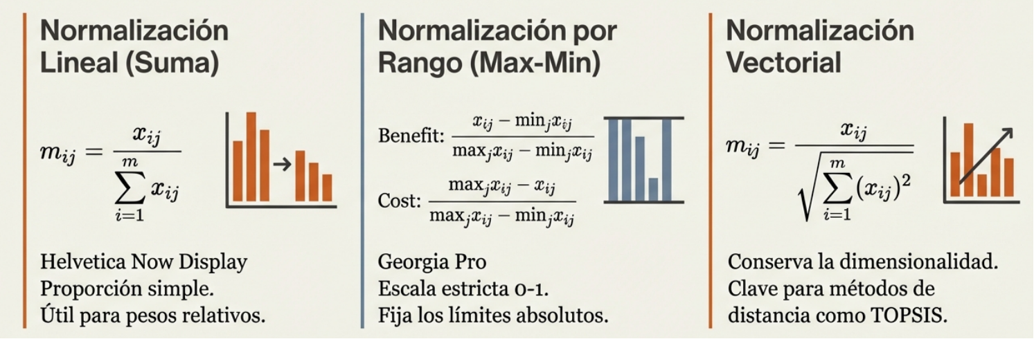 El mayor obstáculo estratégico al evaluar opciones es la disparidad de unidades. ¿Cómo se sopesa el beneficio de la velocidad frente al coste del riesgo o el precio de un activo? Aquí es donde entra en juego la normalización, una técnica matemática que permite unificar escalas y convertir los datos xij en valores adimensionales mij comparables entre sí.