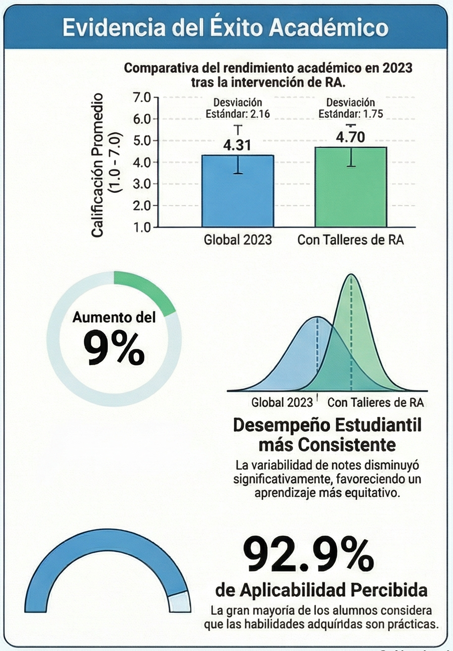Los resultados cuantitativos del marco SEBAS constituyen una prueba de su impacto. El uso de esta metodología ha permitido elevar la nota media global de 4,31 a 4,70. Un análisis mediante la prueba t de Welch confirmó que estos resultados son estadísticamente significativos (p < 0,01), especialmente en los cursos con mayor integración tecnológica. Además, la dispersión del rendimiento disminuyó, ya que la desviación estándar bajó de 2,16 a 1,75.