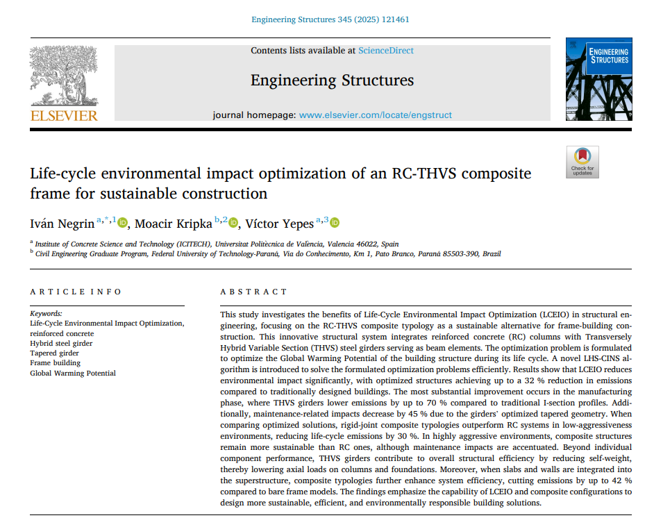 NEGRÍN, I.; KRIPKA, M.; YEPES, V. (2025). Life-cycle environmental impact optimization of an RC-THVS composite frame for sustainable construction. Engineering Structures, 345, 121461. DOI:10.1016/j.engstruct.2025.121461 Featured Paper Award