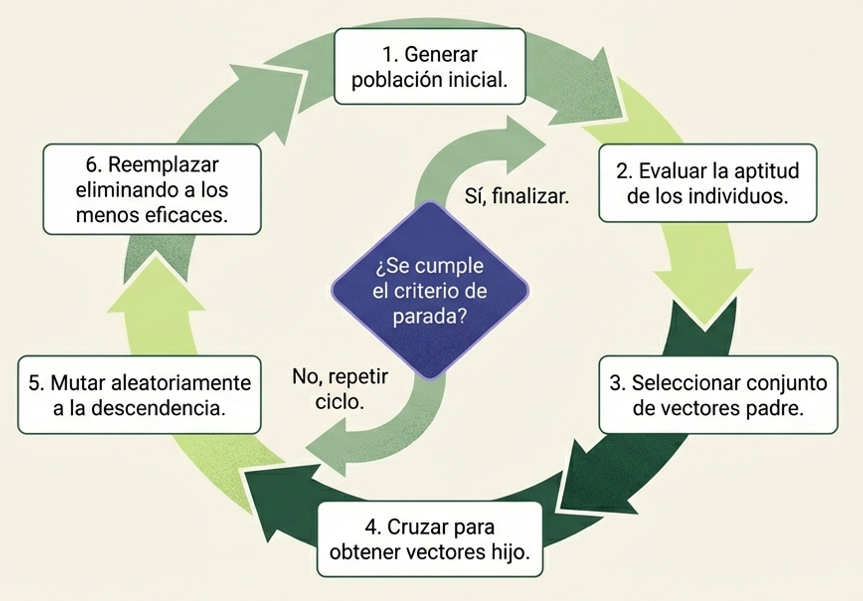 Esta «justicia algorítmica» garantiza que los mejores tengan mayores probabilidades de dejar descendencia. Sin embargo, no garantiza el monopolio de la reproducción, ya que los individuos menos aptos mantienen una pequeña probabilidad de transmitir sus genes. Este «caos controlado» es vital, ya que garantiza la diversidad estructural y evita que el algoritmo se estanque en óptimos locales, es decir, soluciones que parecen buenas solo porque el sistema ha perdido la capacidad de mirar más allá de lo inmediato.