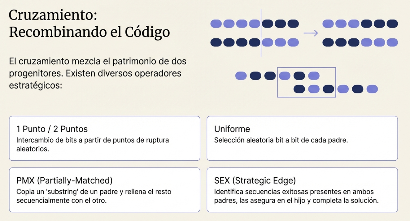 La evolución exige novedad. Si nos limitáramos a clonar a los mejores, el progreso se detendría. Por ello, los algoritmos utilizan la recombinación o cruzamiento, mediante el cual dos progenitores intercambian información para crear descendientes con rasgos mixtos. Se destacan operadores sofisticados como el PMX (Partially-Matched Crossover), que copia un fragmento del código manteniendo las posiciones y rellena el resto con valores no utilizados, y el SEX (Strategic Edge Crossover), que busca identificar y preservar secuencias presentes en ambos progenitores.
