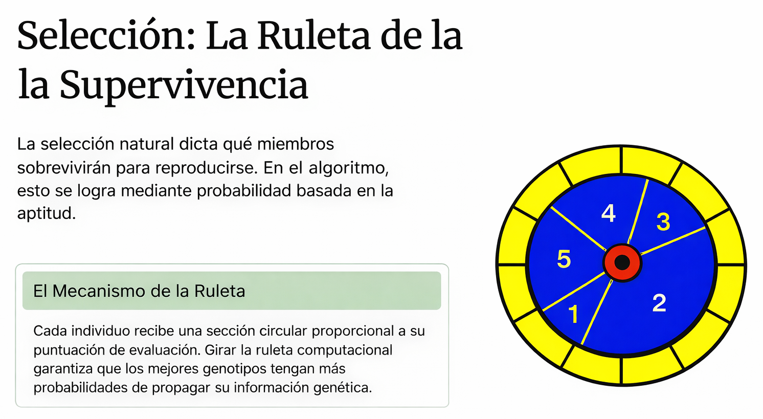 La selección natural no funciona como un sorteo, aunque tampoco actúa como una sentencia absoluta. Este principio se traslada al código mediante el método de la ruleta. En dicho procedimiento, cada solución se representa por un segmento circular cuya superficie es proporcional a su nivel de aptitud.