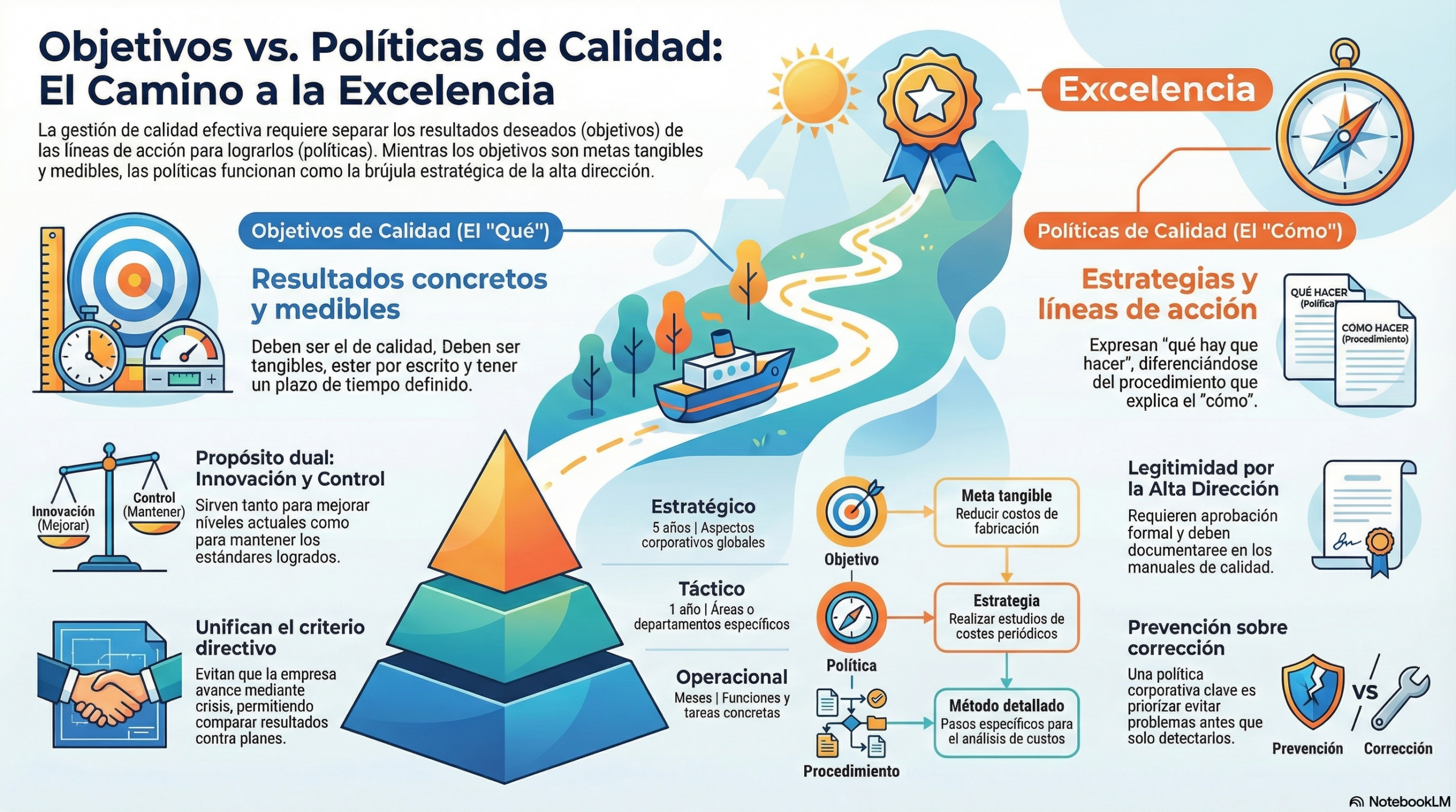Para que una organización alcance los niveles de calidad esperados en sus productos o servicios, es imprescindible establecer formalmente los objetivos y las políticas de calidad. Los objetivos representan las metas tangibles y los resultados concretos que se deben alcanzar en plazos determinados, mientras que las políticas actúan como estrategias o líneas de acción para lograrlos.