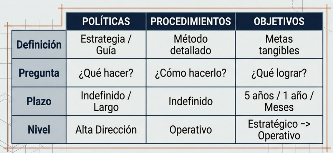 Distinción conceptual: objetivos, políticas y procedimientos.