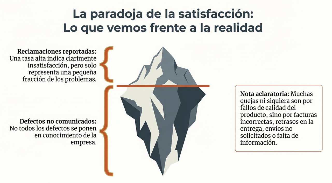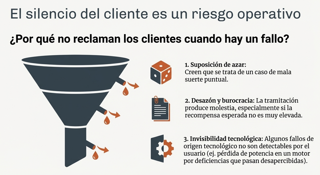 Solo una pequeña fracción de los defectos detectados por el usuario llega formalmente a la organización. Una infraestructura de calidad que ignore esta realidad operará a ciegas y omitirá fallos críticos que erosionan la marca desde dentro. El silencio del cliente dificulta la detección precoz de anomalías en el sistema.