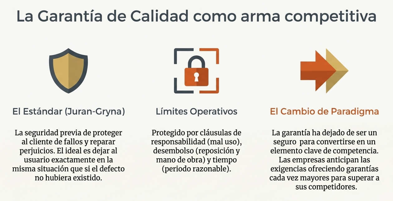 Según Juran-Gryna, la garantía es el compromiso técnico de proteger al cliente frente a la variabilidad del proceso. Su objetivo ideal no se limita a reparar un objeto, sino que también busca restaurar la confianza emocional del usuario. El objetivo es que el cliente quede exactamente en la misma situación que si el fallo nunca hubiera ocurrido, un estándar de excelencia que pocos alcanzan.