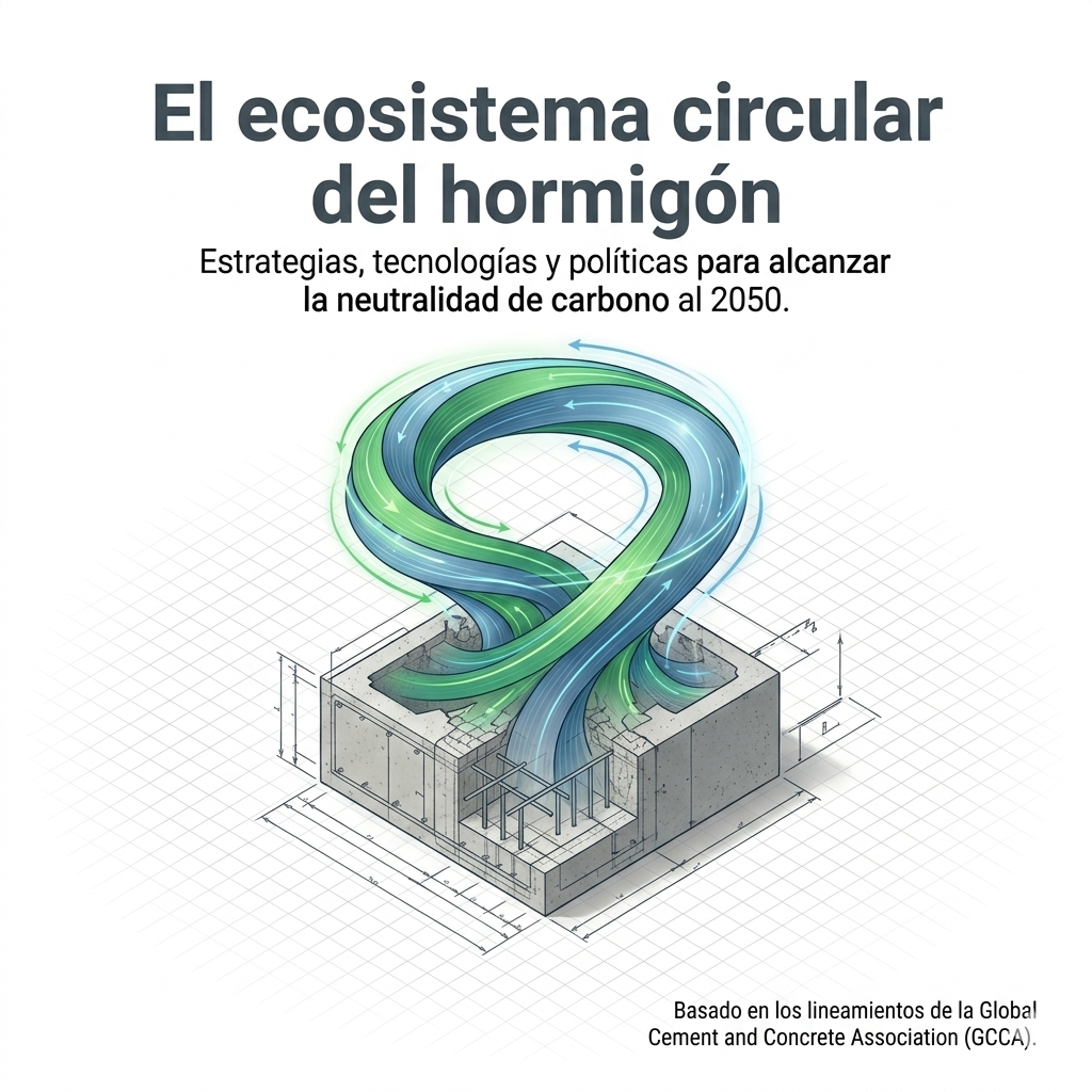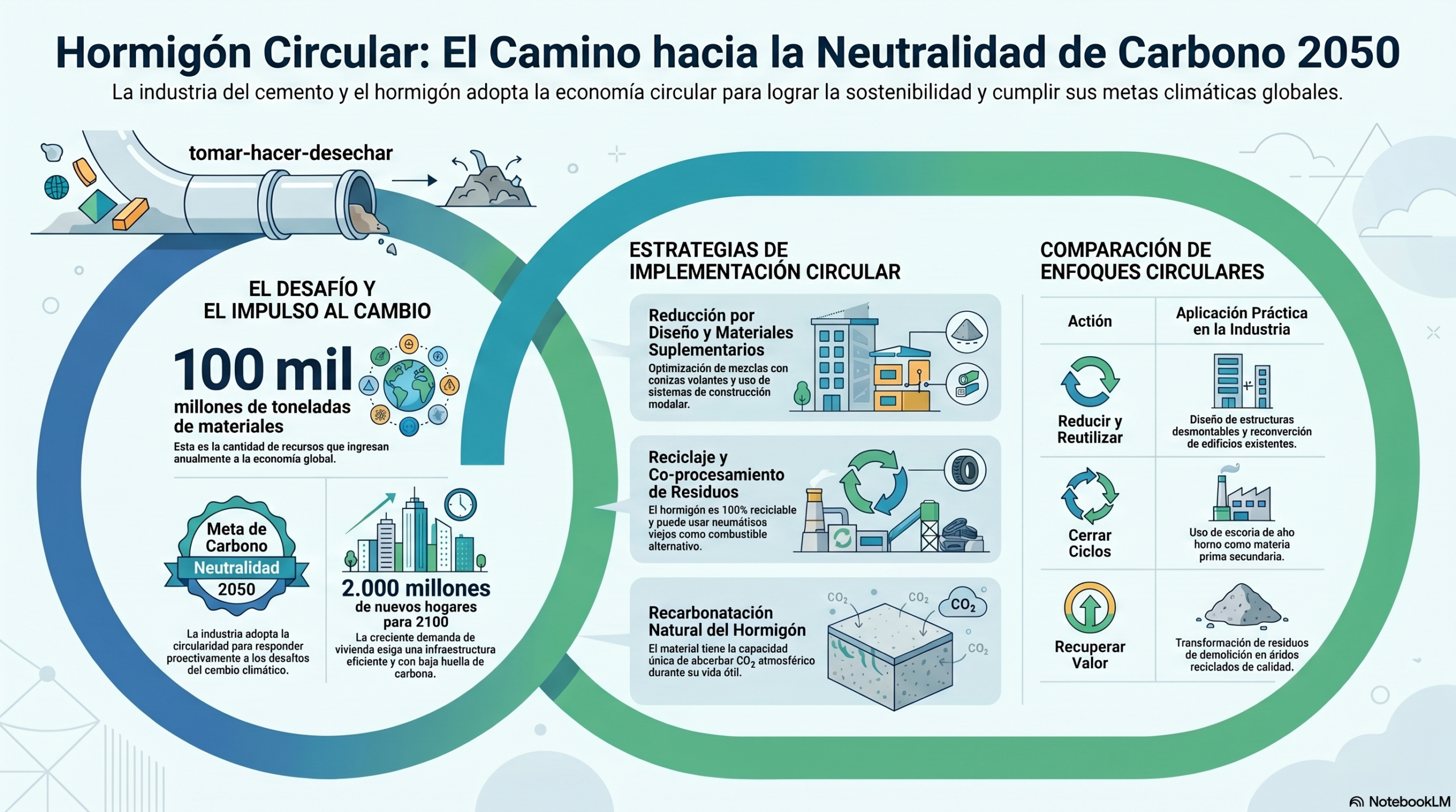 El sector del cemento y el hormigón pretende alcanzar la neutralidad en emisiones de carbono para el año 2050 integrando principios de economía circular en todas sus etapas productivas. Este cambio de paradigma, impulsado por la Global Cement and Concrete Association, propone sustituir el modelo lineal tradicional por estrategias que priorizan la reducción, la reutilización y el reciclaje de materiales.