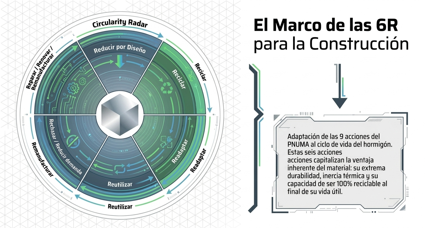 El Programa de Naciones Unidas para el Medio Ambiente (PNUMA) propone las «9R», que en la industria del hormigón se adaptan a estas seis categorías críticas: