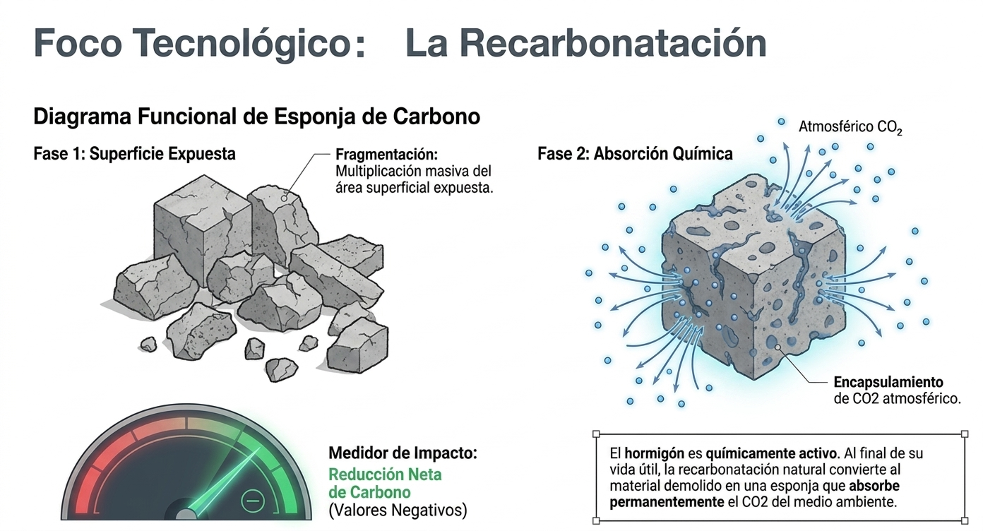 La recarbonatación es un proceso natural disruptivo en el que el hormigón absorbe CO₂ de la atmósfera. Este fenómeno convierte el material en un sumidero de carbono vivo. Un detalle técnico vital es que este proceso se maximiza tras la demolición, ya que aumenta la superficie expuesta del material.