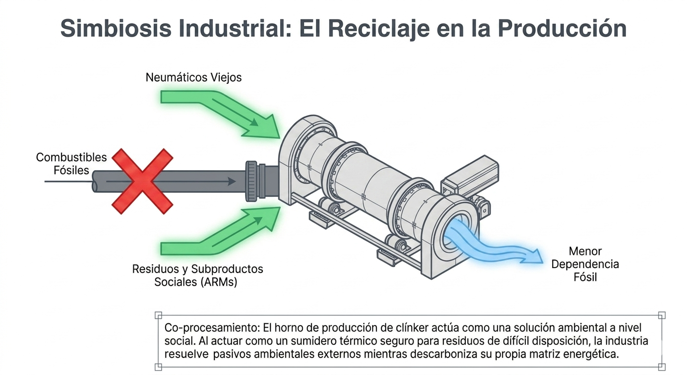 La industria emplea el coprocesamiento, una forma de simbiosis industrial que utiliza residuos como combustibles y materias primas alternativas (ARMs). El uso de neumáticos viejos en hornos de clínker es un caso de éxito emblemático.