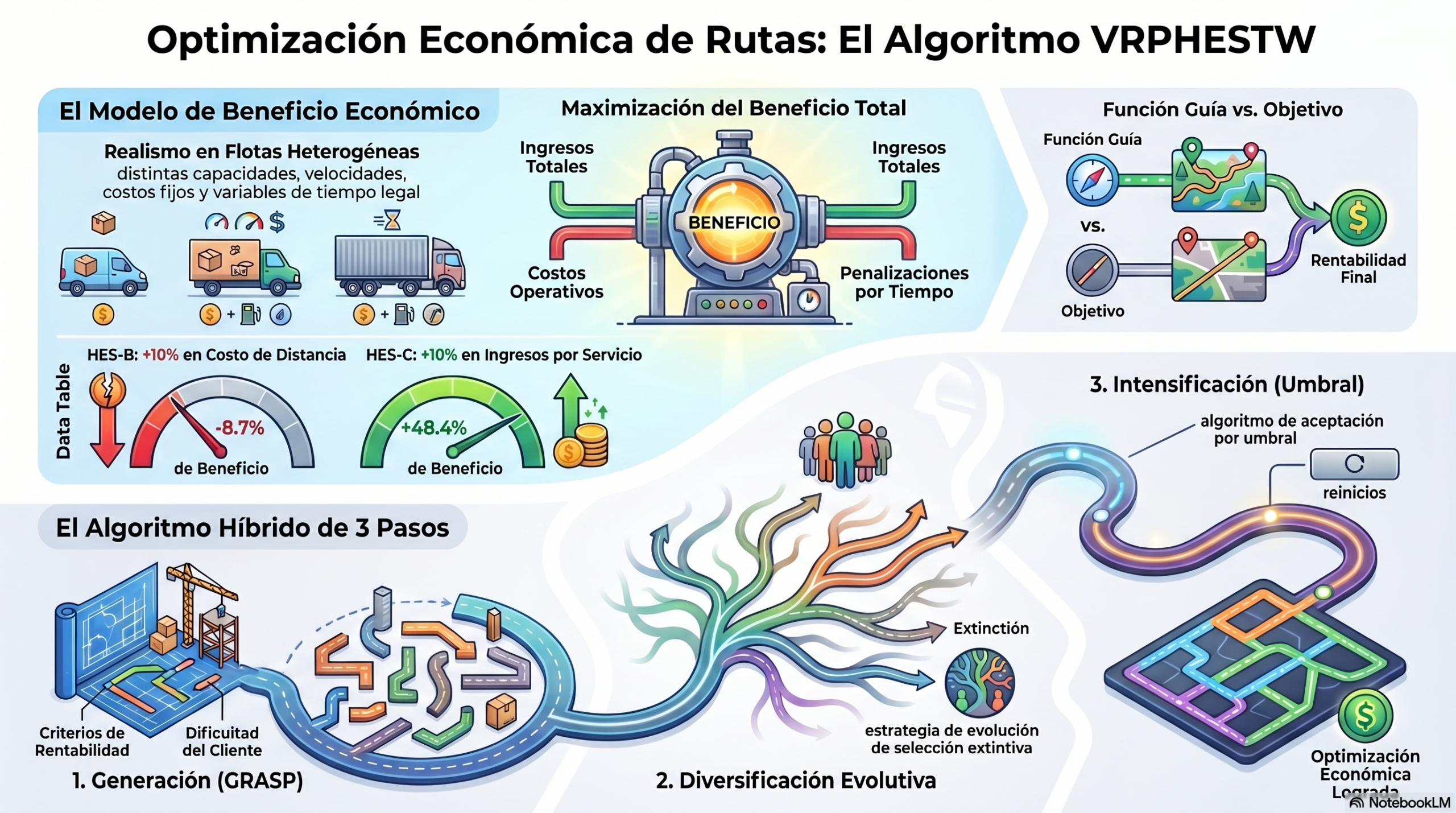 El éxito no consiste en reducir la distancia de forma simplista, sino en maximizar la rentabilidad operativa. Es aquí donde el problema de las rutas de vehículos con flotas heterogéneas y ventanas de tiempo flexibles (VRPHESTW, Vehicle Routing Problem with Heterogeneous Fleet and Soft Time Windows) surge como la respuesta científica al caos logístico. Este modelo trasciende el mapa al integrar variables económicas, humanas y temporales en una única ecuación estratégica. Este artículo se basa en uno de los resultados más importantes de mi tesis doctoral, publicada en un trabajo que podéis encontrar al final de las referencias (Yepes y Medina, 2006).
