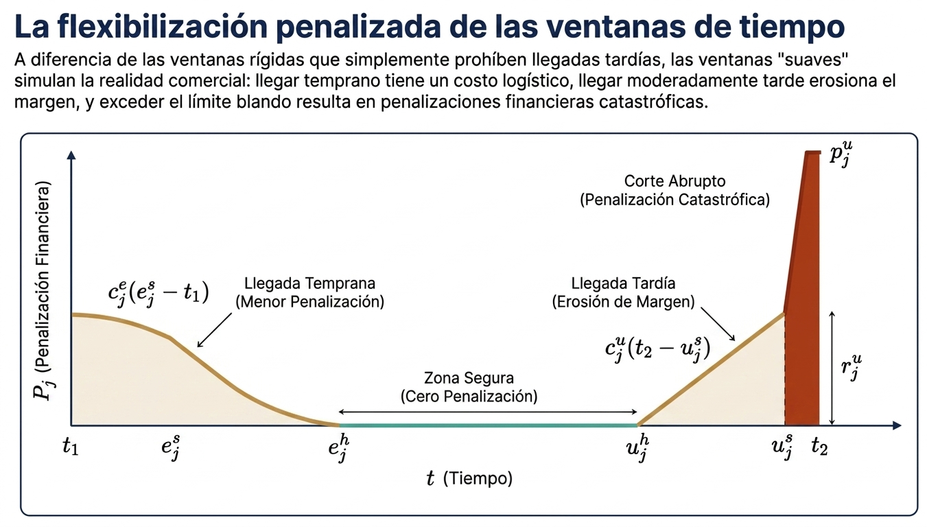En lugar de prohibir las entregas fuera de horario, el modelo establece una penalización económica escalonada en función de la antelación o el retraso. Esta flexibilidad calculada permite que el sistema de optimización identifique rutas que, aunque «incumplen» ligeramente el horario, logran una consolidación de carga tan eficiente que el beneficio neto final es muy superior al de una ruta de cumplimiento rígido. Se pasa así de una logística de obediencia a una logística de resultados.