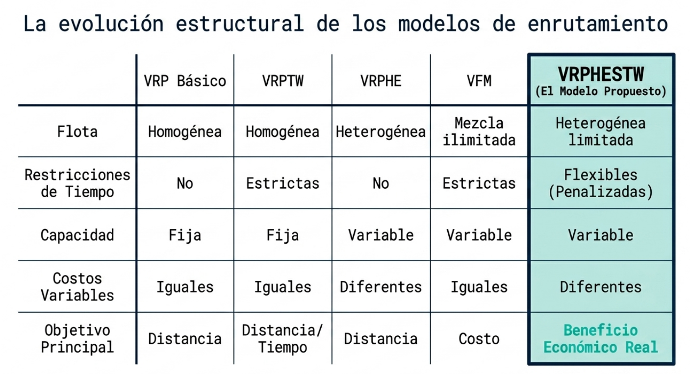 En este análisis, la selección de vehículos (categorizados como k = 1, 2 o 3) no solo se basa en el volumen de carga, sino también en un equilibrio sofisticado entre: