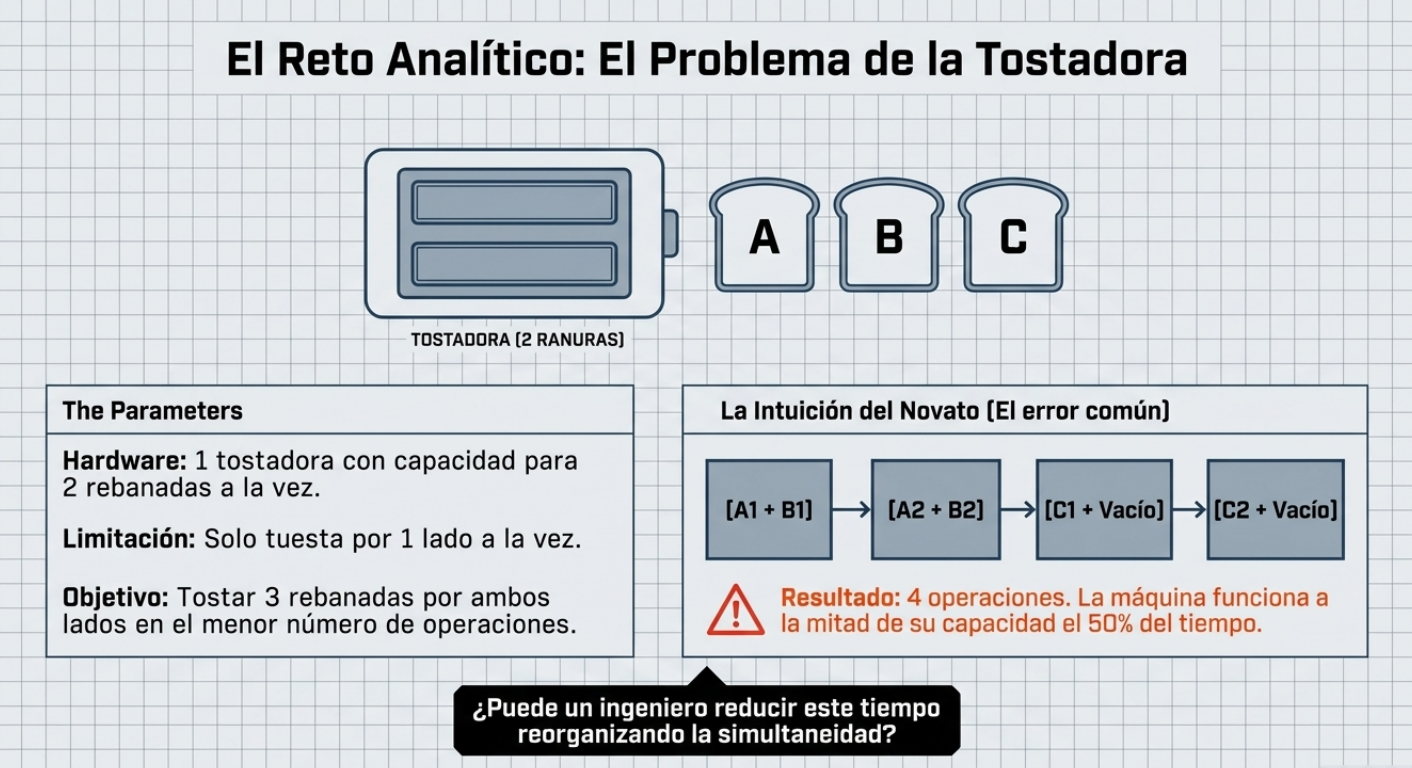 El famoso «reto de la tostadora» ilustra este concepto. Si tenemos tres rebanadas de pan y una tostadora que solo tuesta dos a la vez y por un solo lado, la lógica dicta que son necesarias cuatro operaciones.